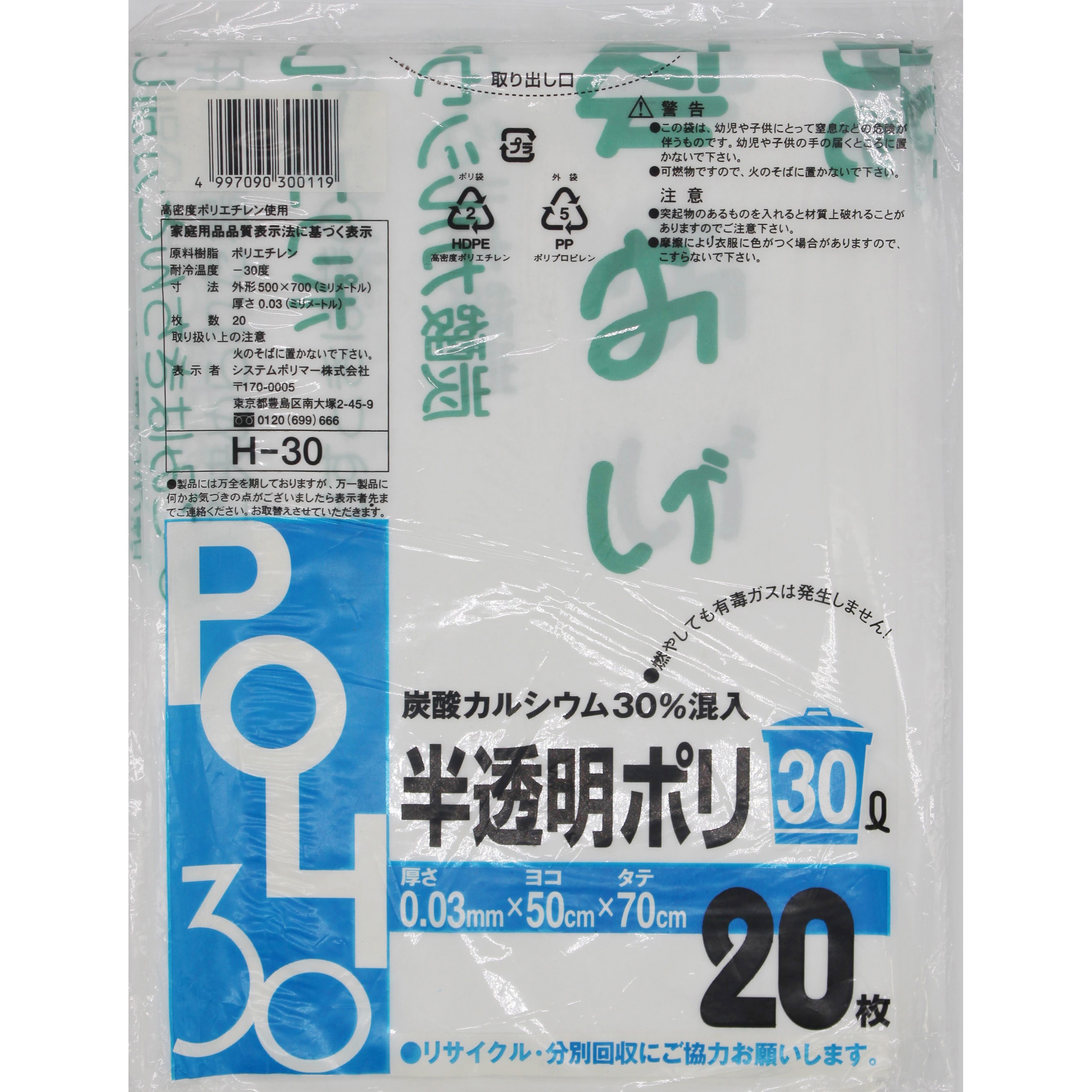 H-30 炭酸カルシウム入りゴミ袋 システムポリマー 半透明色 30L 1箱(20枚×30冊)