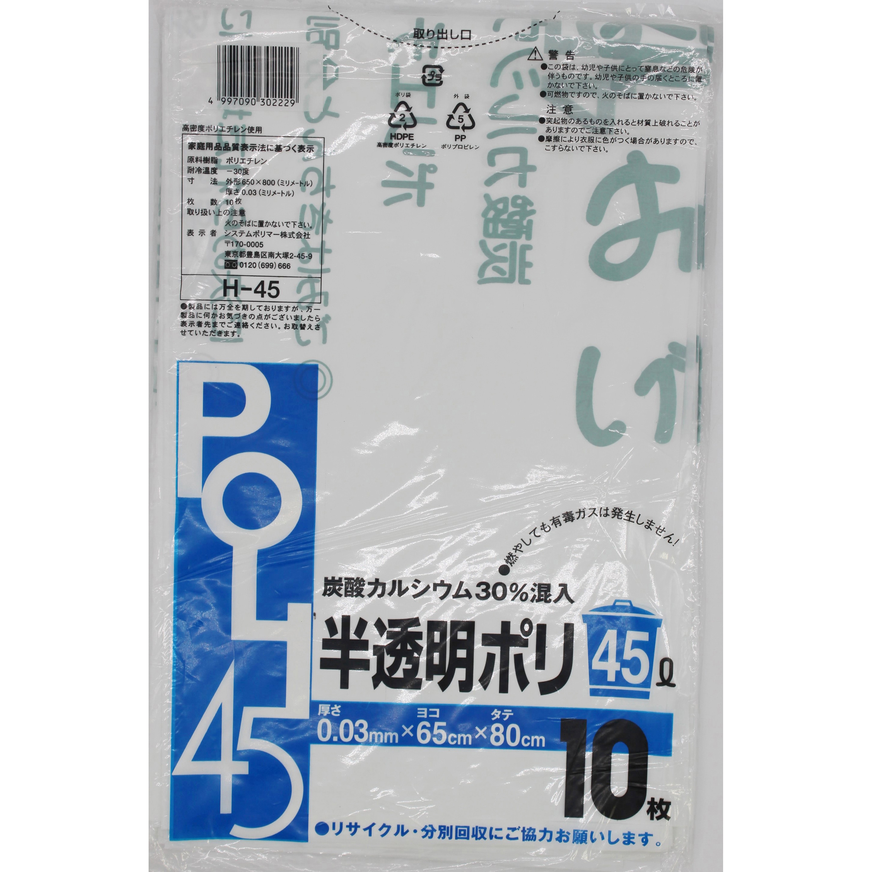 H-45 炭酸カルシウム入りゴミ袋 システムポリマー 半透明色 45L 1箱(10枚×60冊)